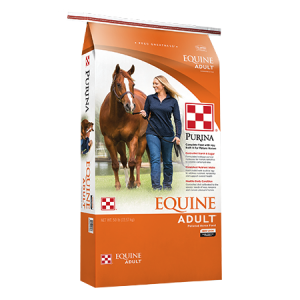 - Equine Adult® horse feed may be fed as a complete feed because it is formulated with high-quality roughage.Good quality hay or pasture may be fed along with Purina® Equine Adult® horse feed. When fed with hay, reduce about 1.0 lb for each 1.5-2.0 lbs of hay offered.