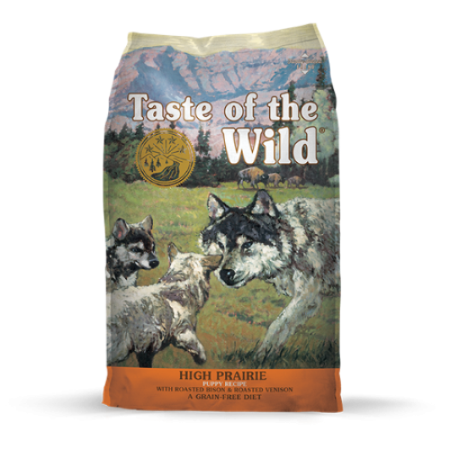 Taste of the Wild High Prairie Puppy Recipe is made with roasted bison and roasted venison combined in this grain-free recipe, providing ideal amounts of highly digestible energy for your growing puppy. Unique flavors from roasted meats, vegetables, legumes and fruits in a small kibble size make it easy for puppies to enjoy the nutrients they need for overall vitality. Because of the guaranteed levels of DHA and perfectly balanced nutrition, this formula is great for pregnant or nursing mothers and other adult dogs as well.