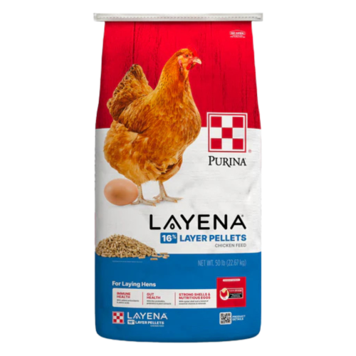 Purina Layena pellets and crumbles are available in 10 lb, 25 lb, 40 lb, and 50 lb bags.