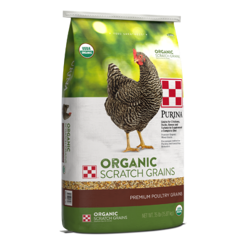 Purina Organic Scratch Grains is a 3-grain scratch encourages natural pecking and feeding behavior, and certified USDA Organic fulfilling the requirements of the USDA to guarantee the product is made without the use of pesticides, fertilizers, and genetically modified organisms.